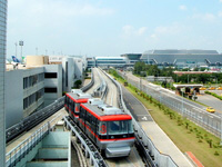 台湾の空の玄関口,台湾桃園国際空港の第1ターミナルと第2ターミナル間をシャトル運転しています。北路線と南路線があり,航空機の乗継そして空港内従業員の移動に活躍しています。車両は,ステンレス車体に赤と黒のラインが入った1両編成です。南路線では,当社の新交通システムで,唯一連結運転を実施しています。 台湾の気候に合わせて,冷房装置の容量をアップしているなどの特徴があります。