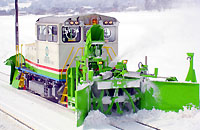 線路上に降り積もった雪を排雪するモータカーロータリーです。前位側には排雪する為の雪鋤を装備し、後位側には投雪するロータリー装置が装備されています。 雪の無い季節には、雪装備を取外し、レール運搬や、材料運搬のモータカーとして使用されます。