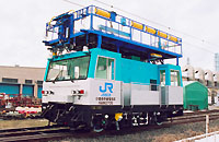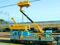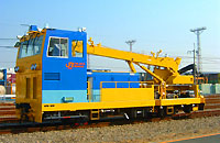 新幹線の電柱及び固定ビームの老朽取替工事に使用するモータカーです。 吊上げ荷重4.9トンの油圧式クレーンを装備しています。
