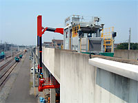 新幹線の高架橋コンクリートの点検を行うモータカーです。 モータカー後部に特殊な作業台が装備され、高架橋を下側から点検することができます。